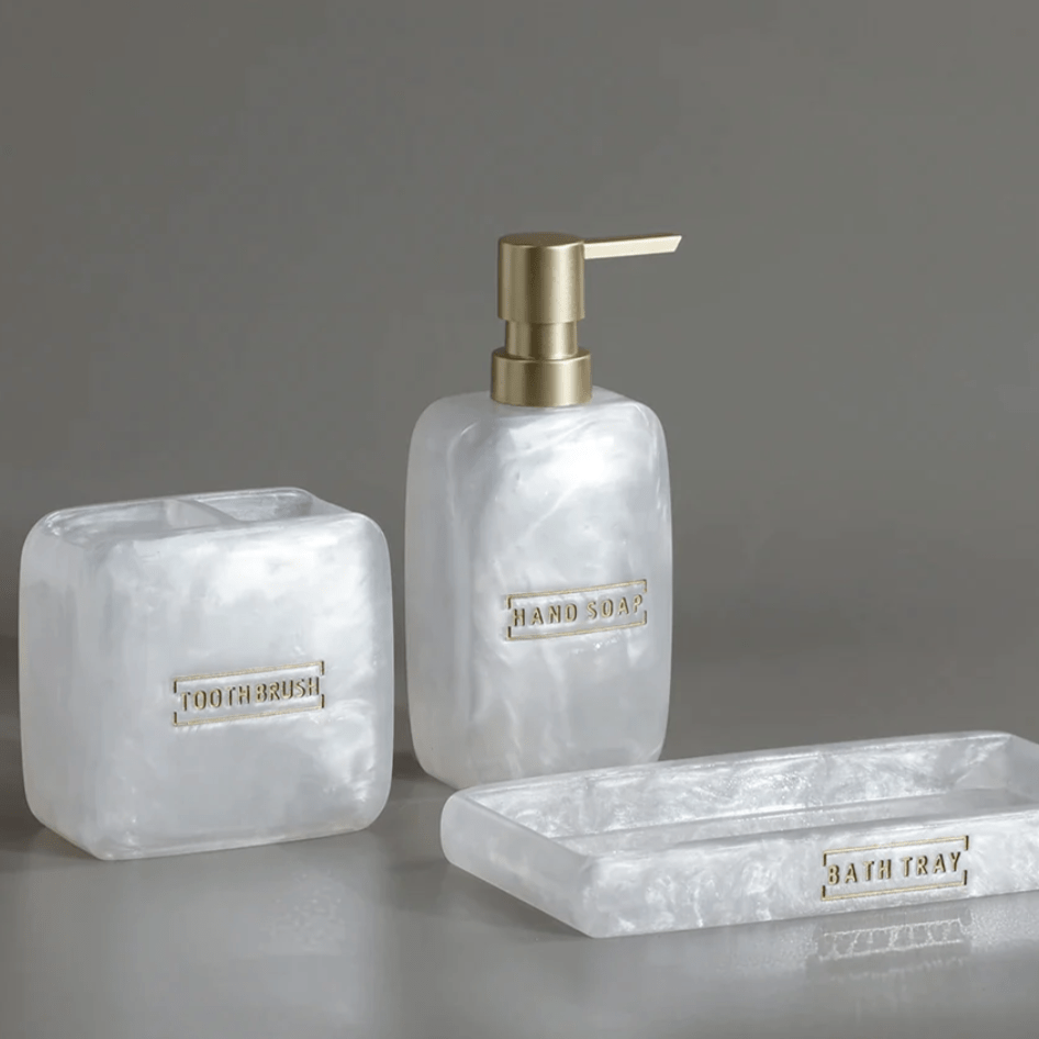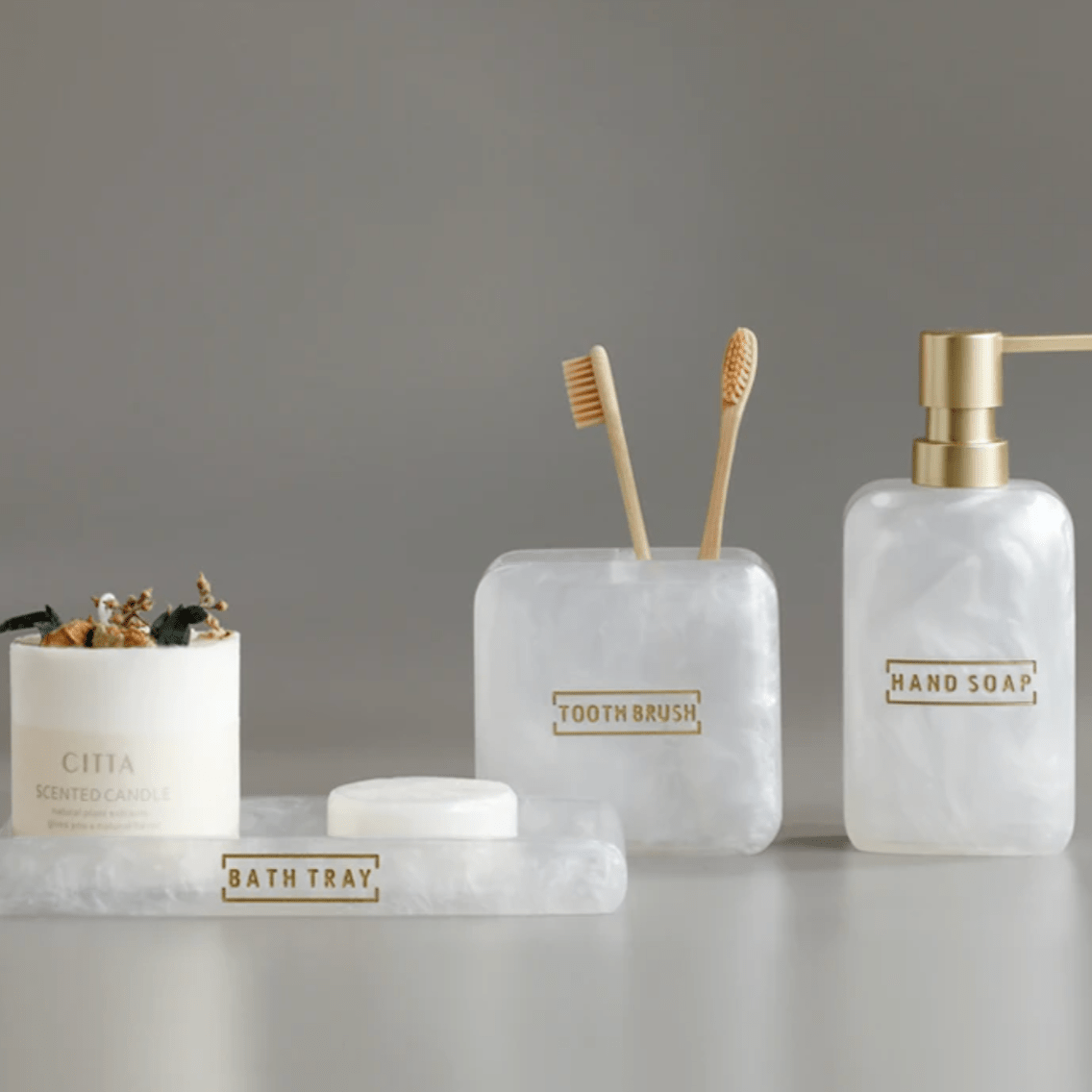 Komplet sæt: Indeholder en sæbedispenser, tandbørsteholder og en opbevaringskrukke, alle med et sømløst design, der skaber harmoni i badeværelset.